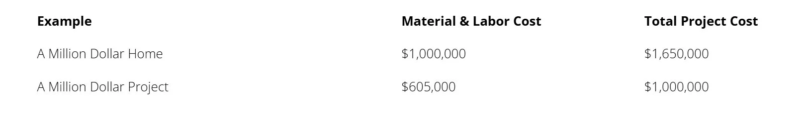If you wanted to build a $1,000,000 home—a home that costs $1,000,000 for material and labors—how much would your total project cost be? The answer is about $1.65 million dollars.